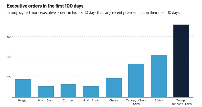 In the NBC News story above, the data concerning Trump’s executive orders at the start of his second term are contextualised by a visual comparison to previous leadership activity, demonstrating the extent of variation.