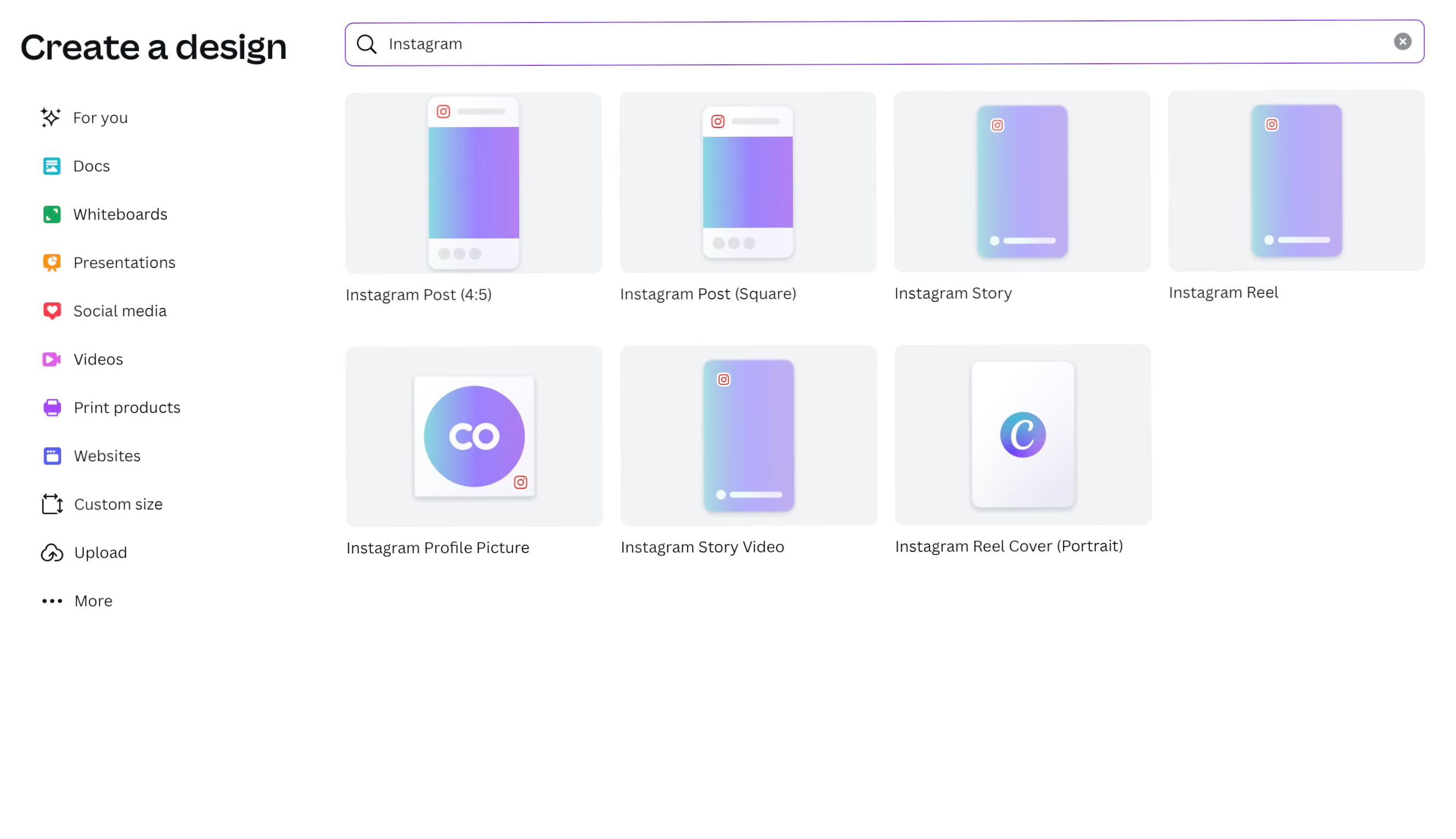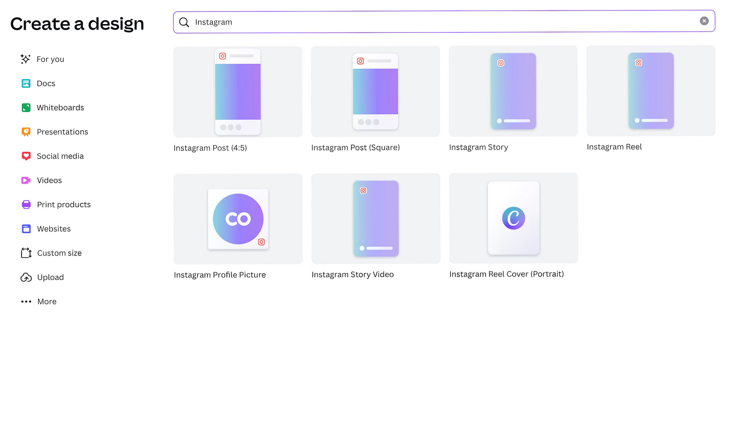 In Canva, typing “Instagram” into the Create toolbar that runs along the left-hand side of a desktop browser brings up multiple different potential templates, each with an Instagram appropriate aspect ratio.