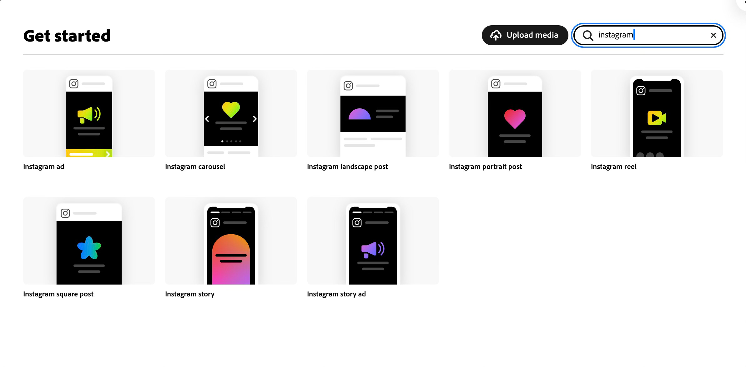 Adobe Express is much the same, with a similar left-hand side toolbar and search feature that allows for the specific discovery of Instagram post templates.